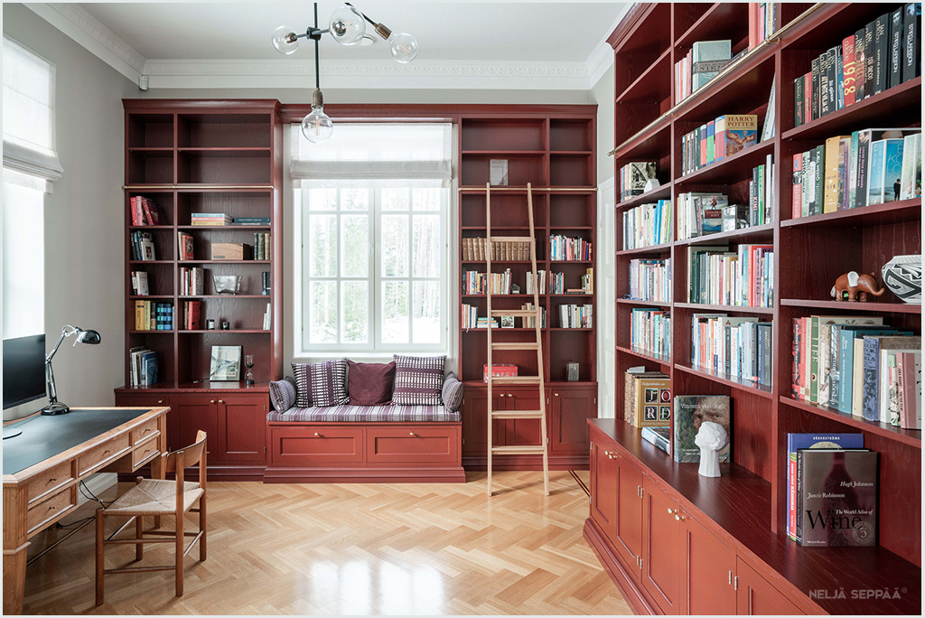 Kirjastokalusteet voivat muodostaa monikäyttöisen huonetilan. Kirjahyllyjen lisäksi kalusteisiin voidaan integroida työpöytiä, istuinryhmiä ja muita kalusteita, jotka tekevät tilasta monipuolisen ja toimivan. Tämä mahdollistaa sen, että sama tila voi toimia niin rauhallisena työ,- ja opiskelutilana kuin koko perheen yhteisenä oleskelualueena monessa eri käyttötarkoituksessa.
